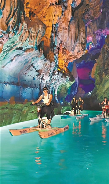 “比漂流更有‘贴地感’!手碰着微凉的岩壁,还能随时停下来看钟乳石!”广州游客张先生刚骑完地下河首推的水上自行车,就兴奋地展示手机里的视频。