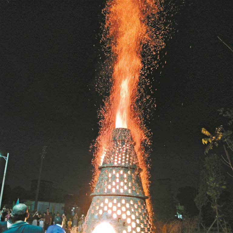 据村民描述,为了助燃和增加色彩,烧的时候会在塔口放上些木糠柴或禾秆草之类物品,让温度更高。有时村民还可以往上面撒些粗盐,爆裂后绽发出无数的小火花,用长竹竿向塔口撩动,火花就会从塔周围向塔顶集中喷发,形成很高很美的火光,火舌还会变成火龙直冲云霄,映红半个天边,在夜色中非常壮观。