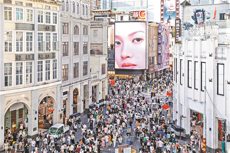 在北京路,在上下九,古老的骑楼披上节日的盛装,红灯笼高挂,五星红旗随风飘扬。人流如潮,笑声、快门声、音乐声交织成节日的乐章。游客驻足欣赏,市民流连拍照,传统与现代在此相遇,历史与活力在此共鸣。北京路和上下九的骑楼街,以它一贯的热情与烟火气,再次成为节日广州最亮丽的风景线。