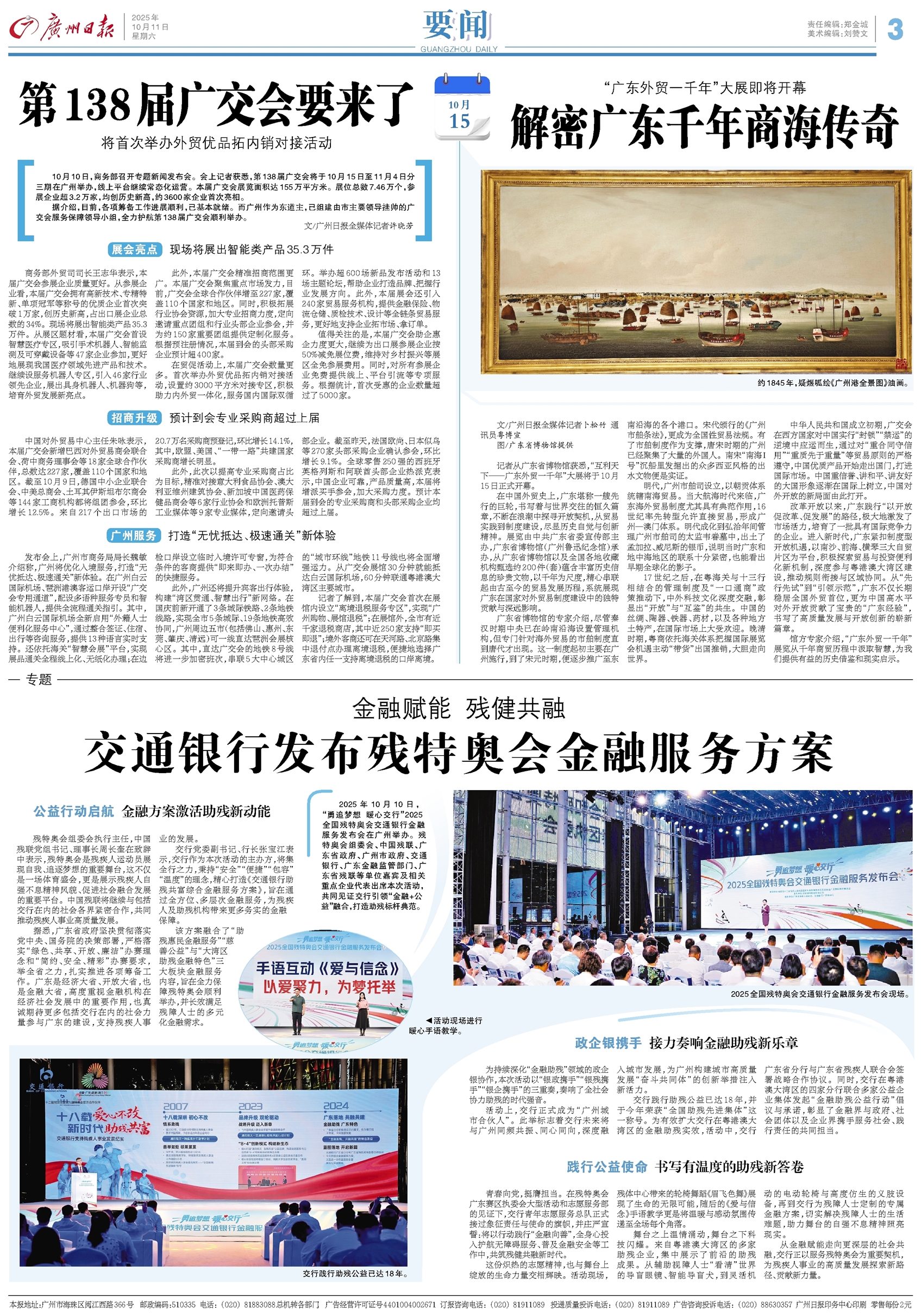 - 第138届广交会要来了 10月10日,商务部召开专题新闻发布会。会上记者获悉,第138届广交会将于10月15日至11月4日分三期在广州举办,线上平台继续常态化运营。本届广交会展览面积达155万平方米。展位总数7.46万个