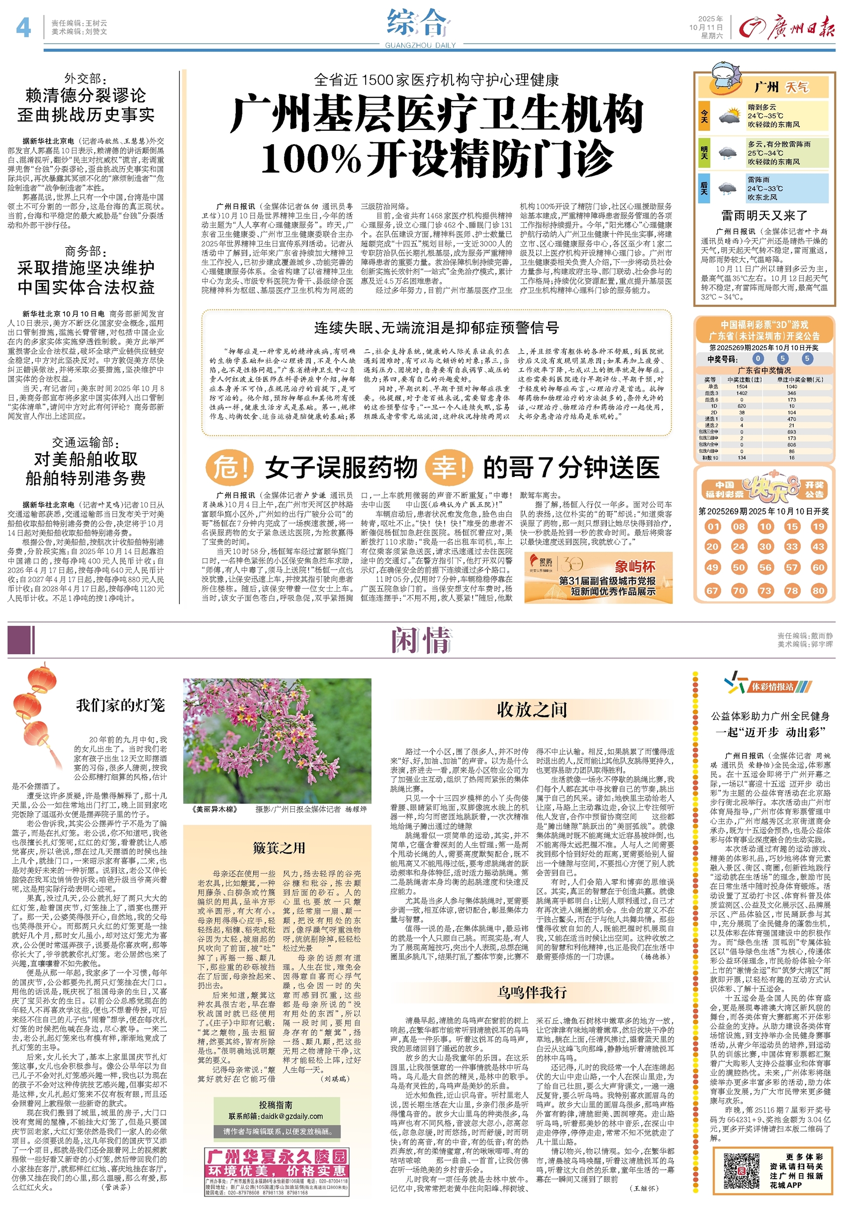 - 广州基层医疗卫生机构100%开设精防门诊 广州日报讯 (全媒体记者伍仞 通讯员粤卫信)10月10日是世界精神卫生日,今年的活动主题为“人人享有心理健康服务”。昨天,广东省卫生健康委、广州市卫生健康委联合主办2025年世界精神卫生日宣传系列