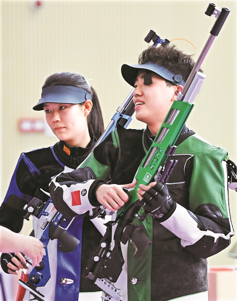 昨日,在广州举行的第十五届全国运动会10米气步枪混合团体决赛中,辽宁队获得冠军,福建队、四川队分获亚军和季军。图为辽宁队选手杜雨宸、刘柏辰(右)。 新华社发