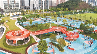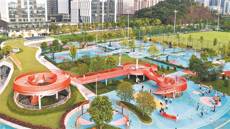 公园充分体现全龄友好理念,园区设有1个11人制标准足球场、4个篮球场、2个网球场和5张乒乓球桌,满足不同运动爱好者的需求,还有专为儿童打造的色彩明快、设施丰富的游乐天地,包含攀岩墙、吊环、沙池等多个项目。