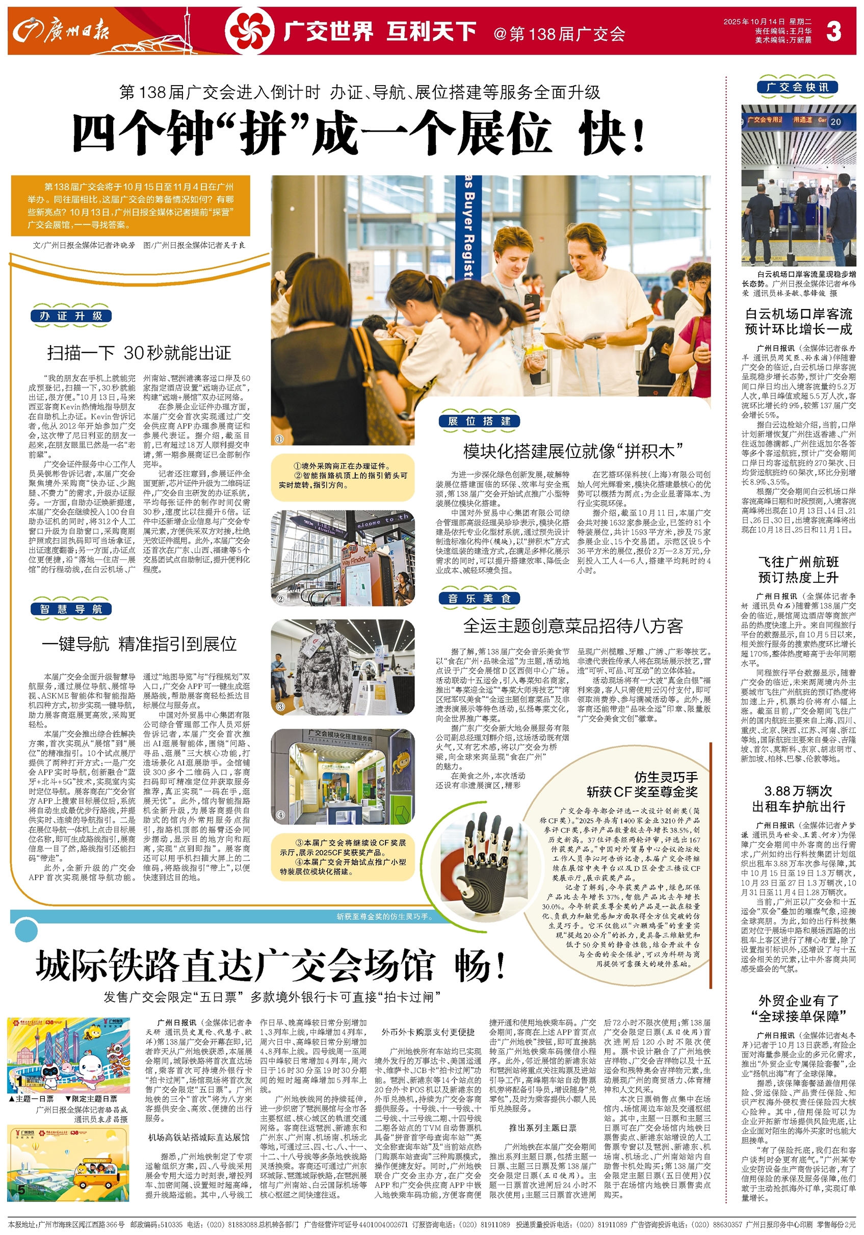 - 四个钟“拼”成一个展位 快! 第138届广交会将于10月15日至11月4日在广州举办。同往届相比,这届广交会的筹备情况如何?有哪些新亮点?10月13日,广州日报全媒体记者提前“探营”广交会展馆,一一寻找答案。 文/广州日报