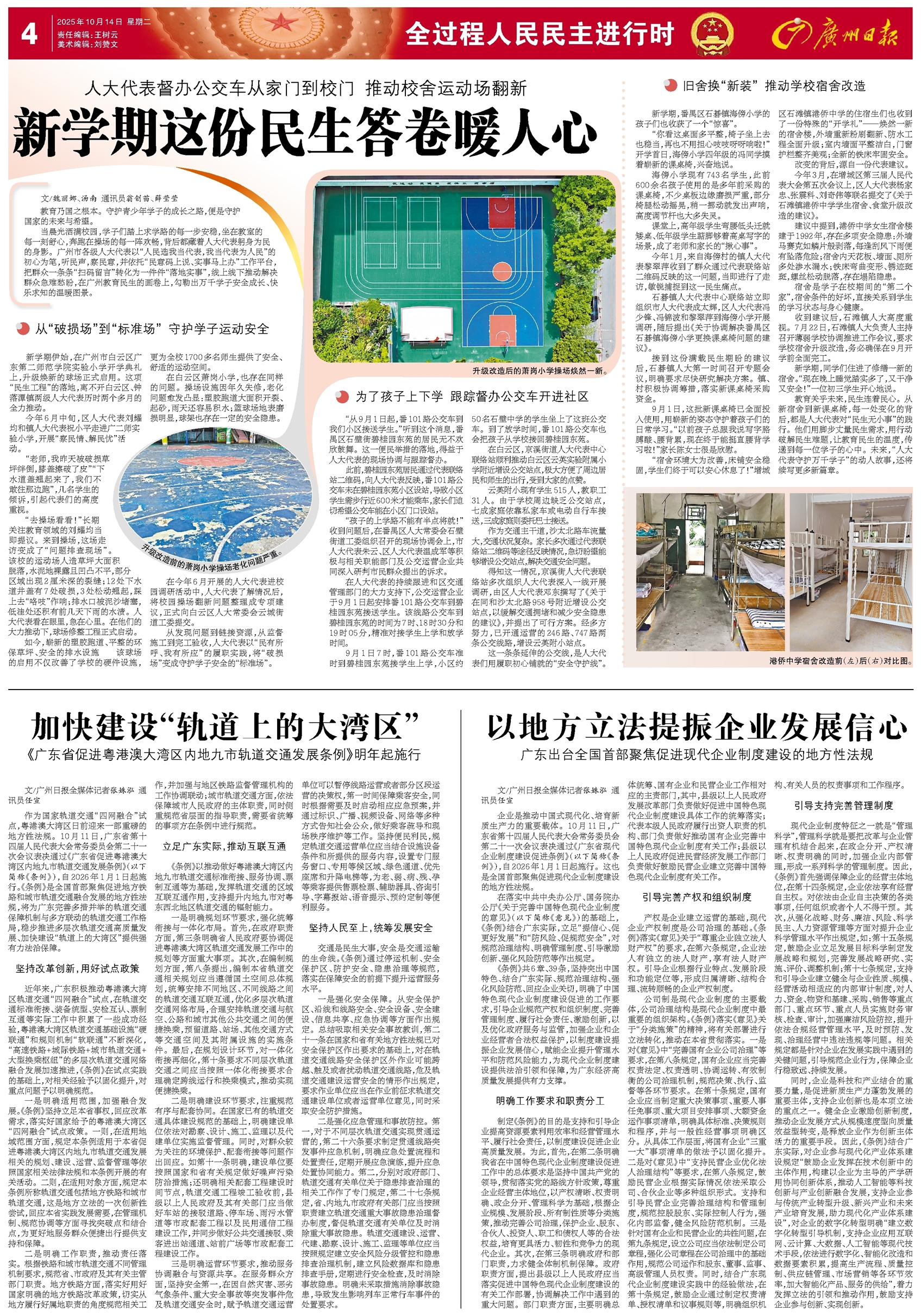 - 加快建设“轨道上的大湾区” 文/广州日报全媒体记者张姝泓 通讯员任宣 作为国家轨道交通“四网融合”试点,粤港澳大湾区日前迎来一部重磅的地方性法规。10月11日,广东省第十四届人民代表大会常务委员会第二十一次会议表决通过《