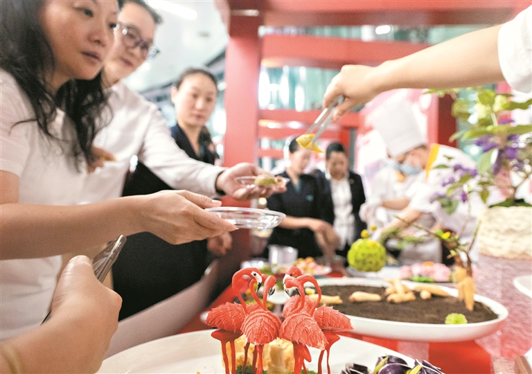 记者在现场了解到,多家星级餐厅推出与全运会相关的菜式。篮球样式的茶点、形似乒乓球的菜肴吸引许多嘉宾注意。“MVP灌篮包、蟹蟹乒乓球是我们结合时令食材,专门为全运会打造的产品,希望运动员们都取得好成绩!”广东点都德国际食品有限公司总经理沈志辉介绍称,餐厅内部管理得到很大提升,已经做好迎接八方客的准备。