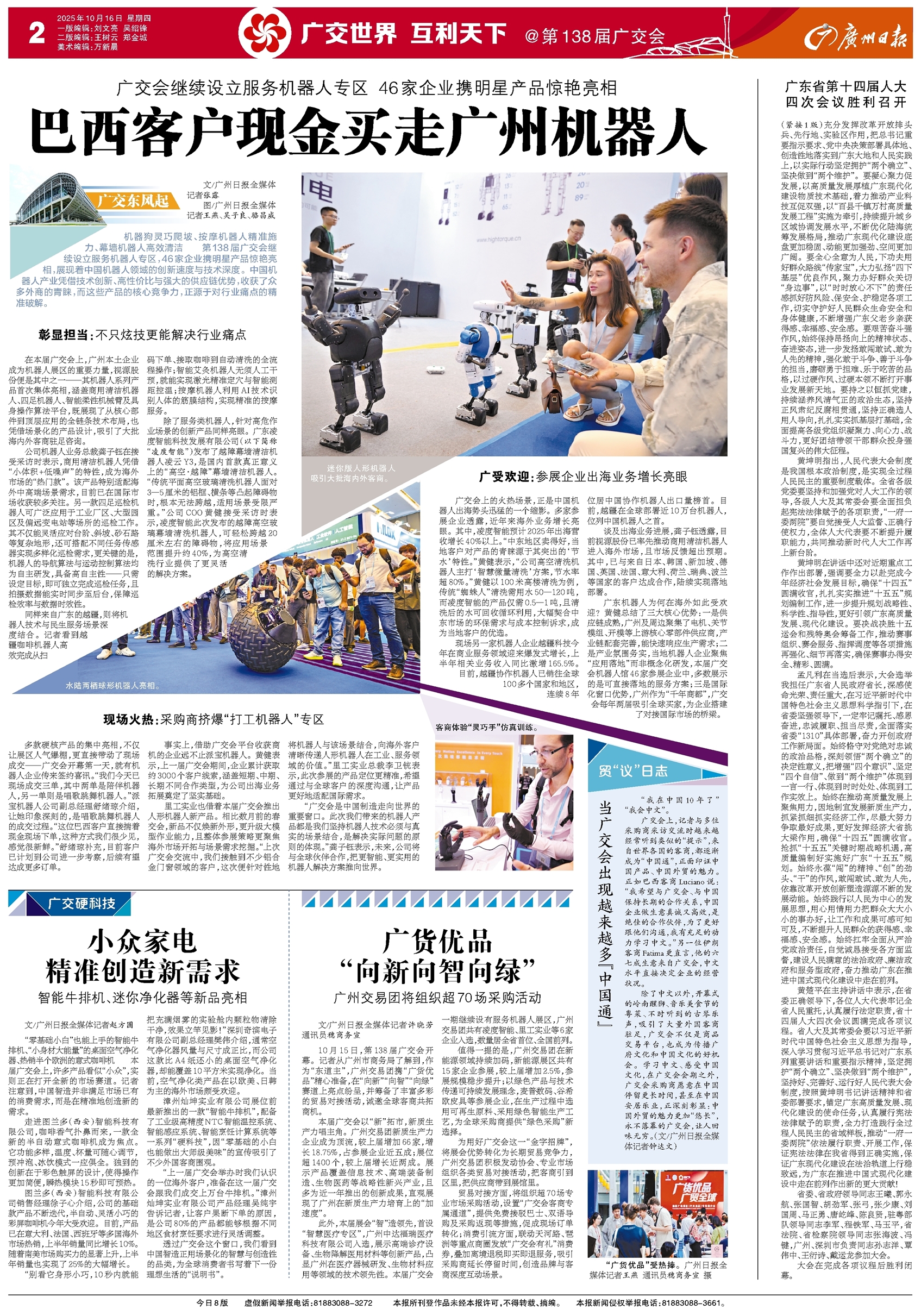 - 巴西客户现金买走广州机器人 广交东风起 文/广州日报全媒体记者张露 图/广州日报全媒体记者王燕、吴子良、骆昌威 机器狗灵巧爬坡、按摩机器人精准施力、幕墙机器人高效清洁……第138届广交会继续设立服务机器人