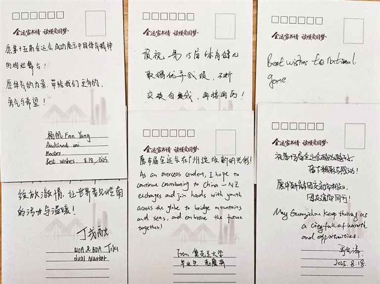 体育是跨越国界的语言,更是维系情感、缔结友谊的纽带。在奥克兰大学,留学生们将对十五运会的期待写在一张张明信片上,字里行间满是青春朝气:“绽放激情,让世界看见岭南的活力与温暖”“愿中新青年因交流而相知,因友谊而同行”……