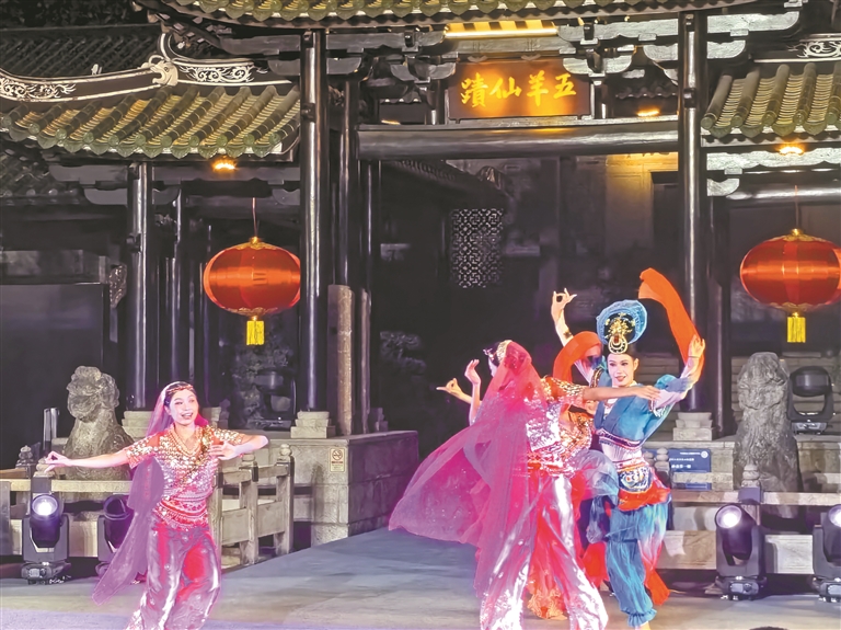 开幕展演中,情景舞蹈《帆起商潮涌》以海上丝绸之路商船航运历史为脉络,海丝主题时装秀《潮创越梦航》呈现跨越时空的美学服饰对话,情景表演《仙临五羊城》则以“五羊传说”为灵感,再现五仙降临、开门赐福的场景,为市民游客带来沉浸式海丝文化体验。