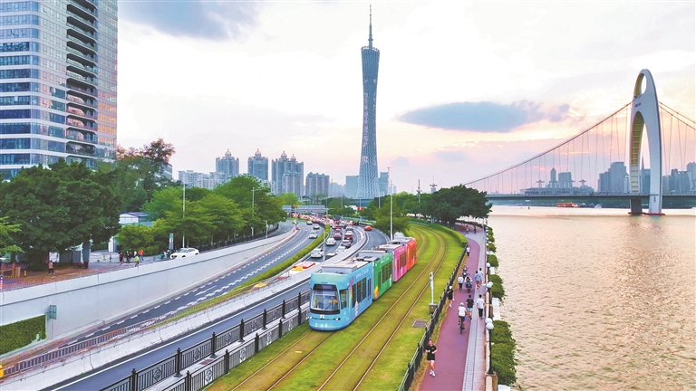 广州迎接十五运会的氛围已拉满,城市各处都能感受到这场体育赛事的热情与活力,图为“全运号”主题列车行驶在珠江边。(资料图)