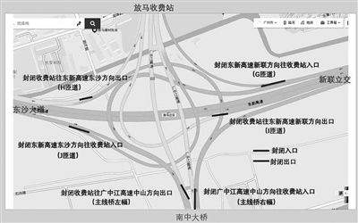 广中江高速主线往放马收费站方向匝道出入口、东新高速东沙大道方向和新联立交方向往放马收费站匝道出入口实施全封闭,禁止所有车辆通行(辖区高速公路管理、施工车辆除外)。