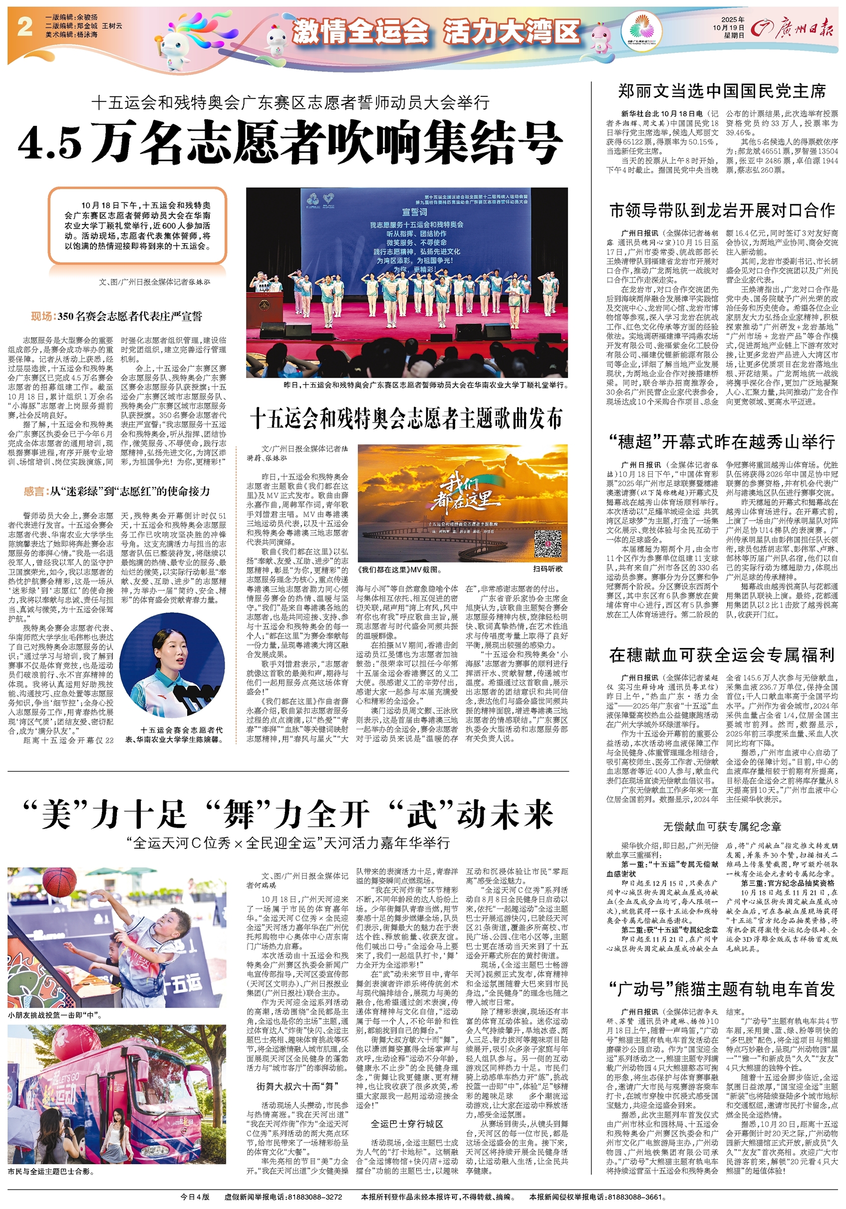 - 4.5万名志愿者吹响集结号 10月18日下午,十五运会和残特奥会广东赛区志愿者誓师动员大会在华南农业大学丁颖礼堂举行,近600人参加活动。活动现场,志愿者代表集体誓师,将以饱满的热情迎接即将到来的十五运会。 文、图/广州