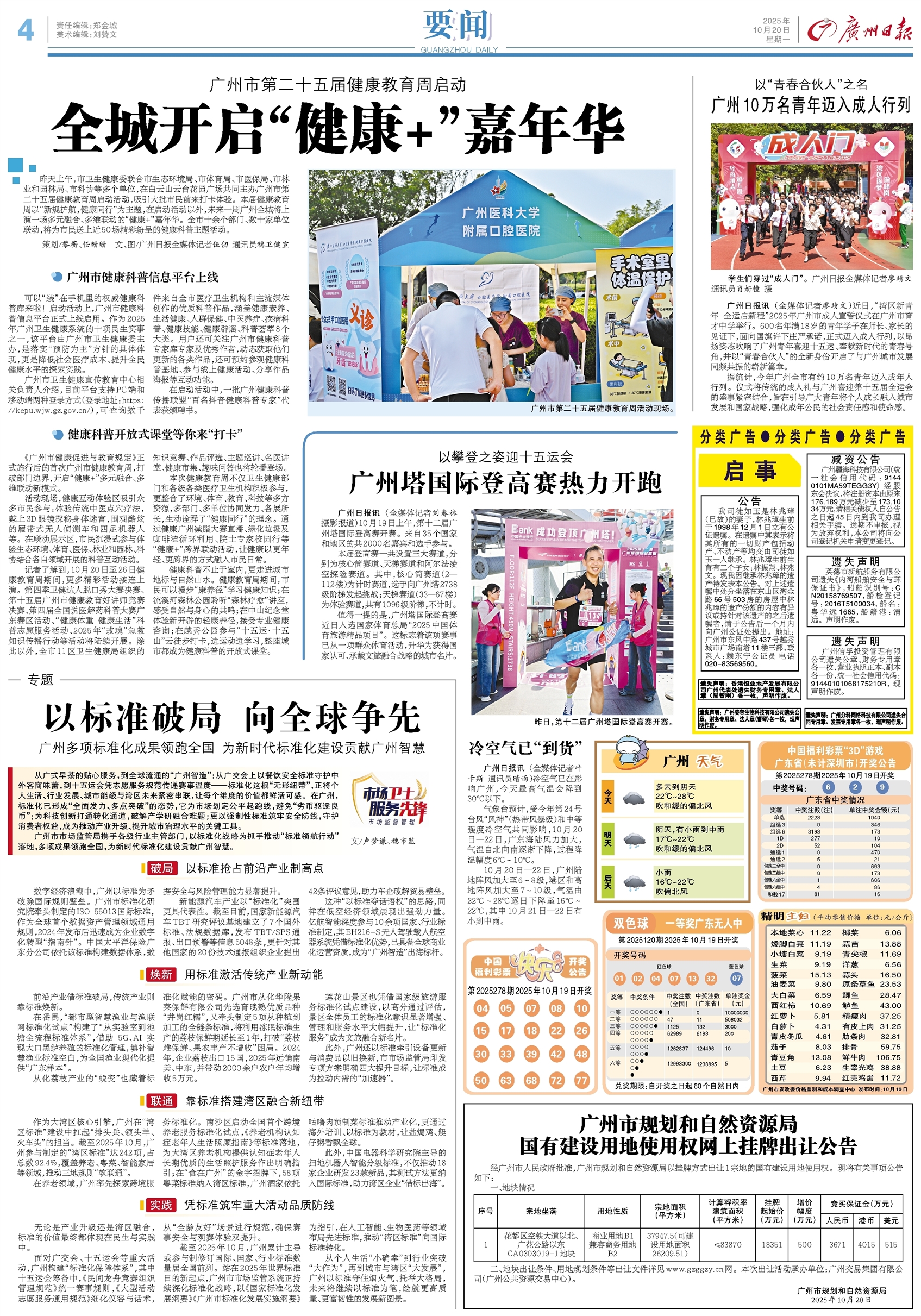 - 全城开启“健康+”嘉年华 昨天上午,市卫生健康委联合市生态环境局、市体育局、市医保局、市林业和园林局、市科协等多个单位,在白云山云台花园广场共同主办广州市第二十五届健康教育周启动活动,吸引大批市民前来打卡体验。本届健康教育