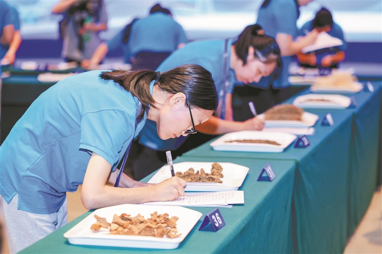 在中药材鉴定竞赛项目实操考核现场,记者看到十几张桌子的桌面上摆放了80种中药材,有动物类、有植物类,还有中药饮片以及中药粉末。参赛选手按照序号依次排开,同时进行鉴定。在每个中药材面前,选手可以停留53秒,通过观看、闻气味、摸质感以及品尝等方式进行鉴定并即刻书写答案。时间一到,选手们必须立刻按照现场指令统一移动到下一个中药材面前,如此重复80次。