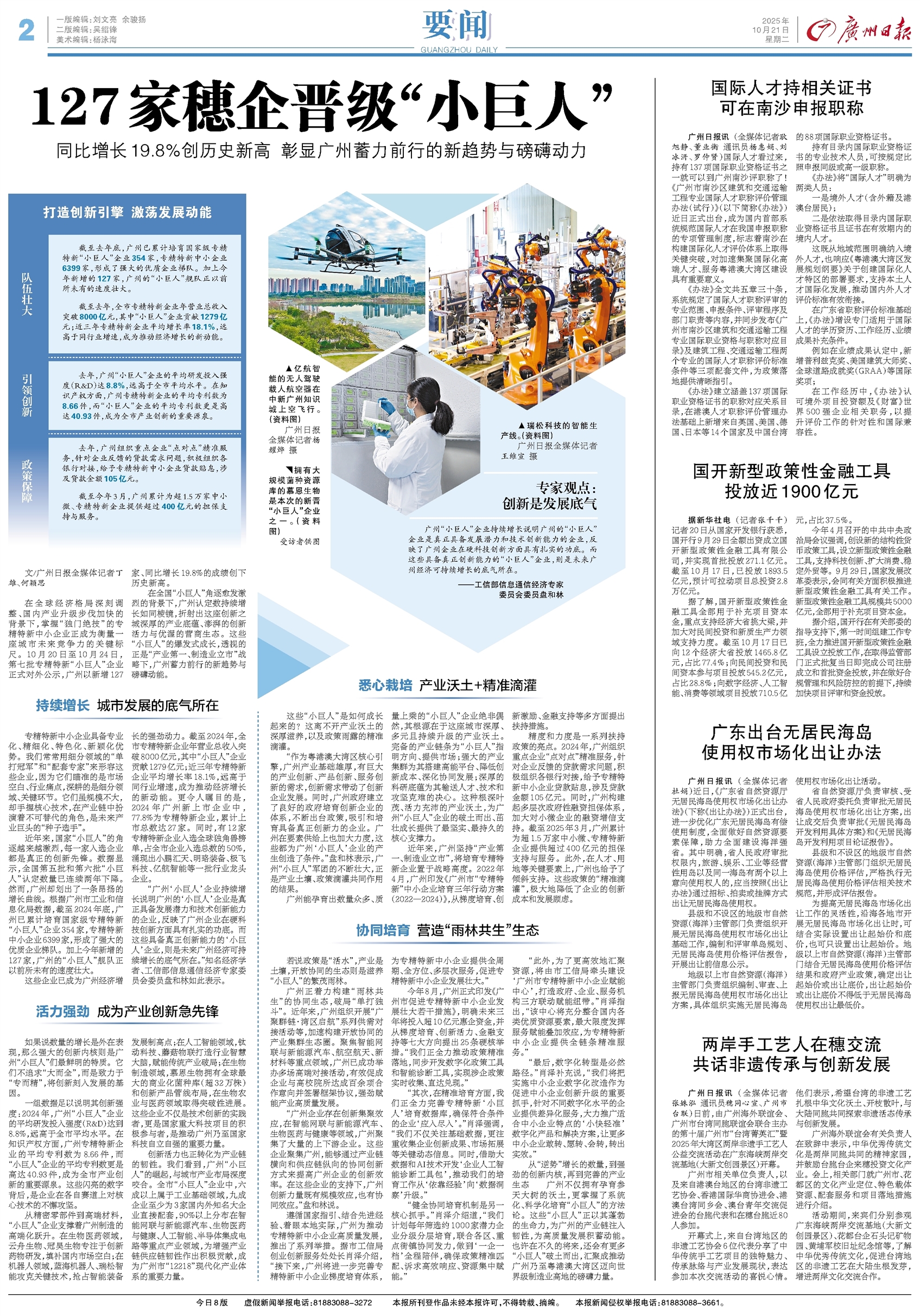 - 127家穗企晋级“小巨人” 打造创新引擎 激荡发展动能 队伍壮大 截至去年底,广州已累计培育国家级专精特新“小巨人”企业354家,专精特新中小企业6399家,形成了强大的优质企业梯队。加上今年新增的127家,广