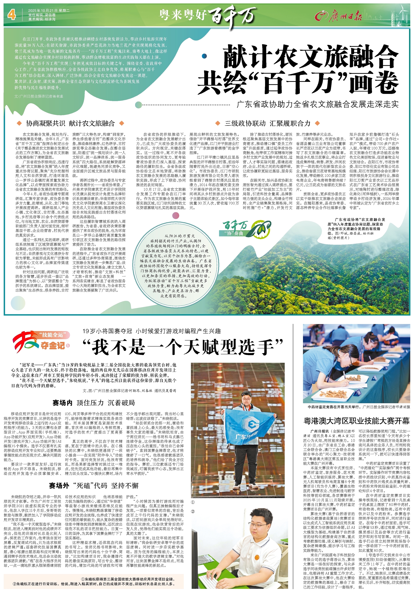 - 献计农文旅融合 共绘“百千万”画卷 百千万“协”奏曲 在江门开平,市政协委员谢沃根推动碉楼古村落焕发新活力,带动乡村旅游实现年客流量30万人次;在韶关翁源,市政协委员严恋花助力当地兰花产业实现规模化发展,使兰花成为当地一张亮