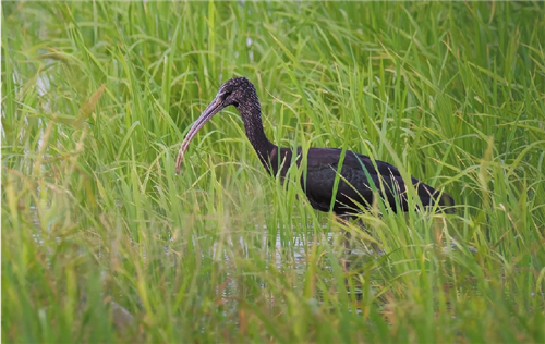 彩鹮,属鹈形目鹮科,与朱鹮是近亲,体形修长,鸟喙似弯刀,通体呈深栗色。彩鹮对栖息地的水质、食物丰富度及人为干扰极为敏感,被视为重要的环境指示物种。这一物种曾因栖息地缩减等原因,被《中国濒危动物红皮书》一度宣布在中国绝迹,2021年已升级为国家一级保护动物。