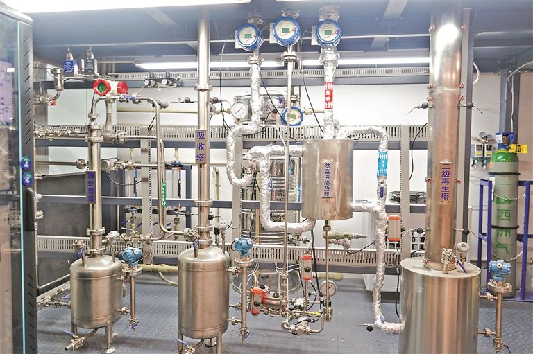 周腾指出,该装置还可用于验证实验室合成的碳捕集材料能否长期稳定运行。“现实中,火电厂、化工厂、水泥厂、钢铁厂等排放的二氧化碳在浓度、温度、压力及杂质组成上差异显著,胺溶液也存在挥发和降解的问题。”为此,中试装置布设了数十个压力、温度和流量传感器,实时记录装置内各流股的关键参数。“我们不仅能利用这些数据迭代模型,为企业量身定制最合适的碳捕集材料,还能验证这些材料在长期运行中的稳定性。”