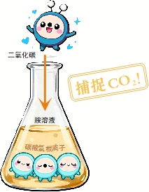 可用于碳捕集的材料种类繁多。“用胺溶液来吸收固碳”是主流技术路线,其原理是:二氧化碳与胺溶液发生化学反应后变成碳酸氢根离子溶解。