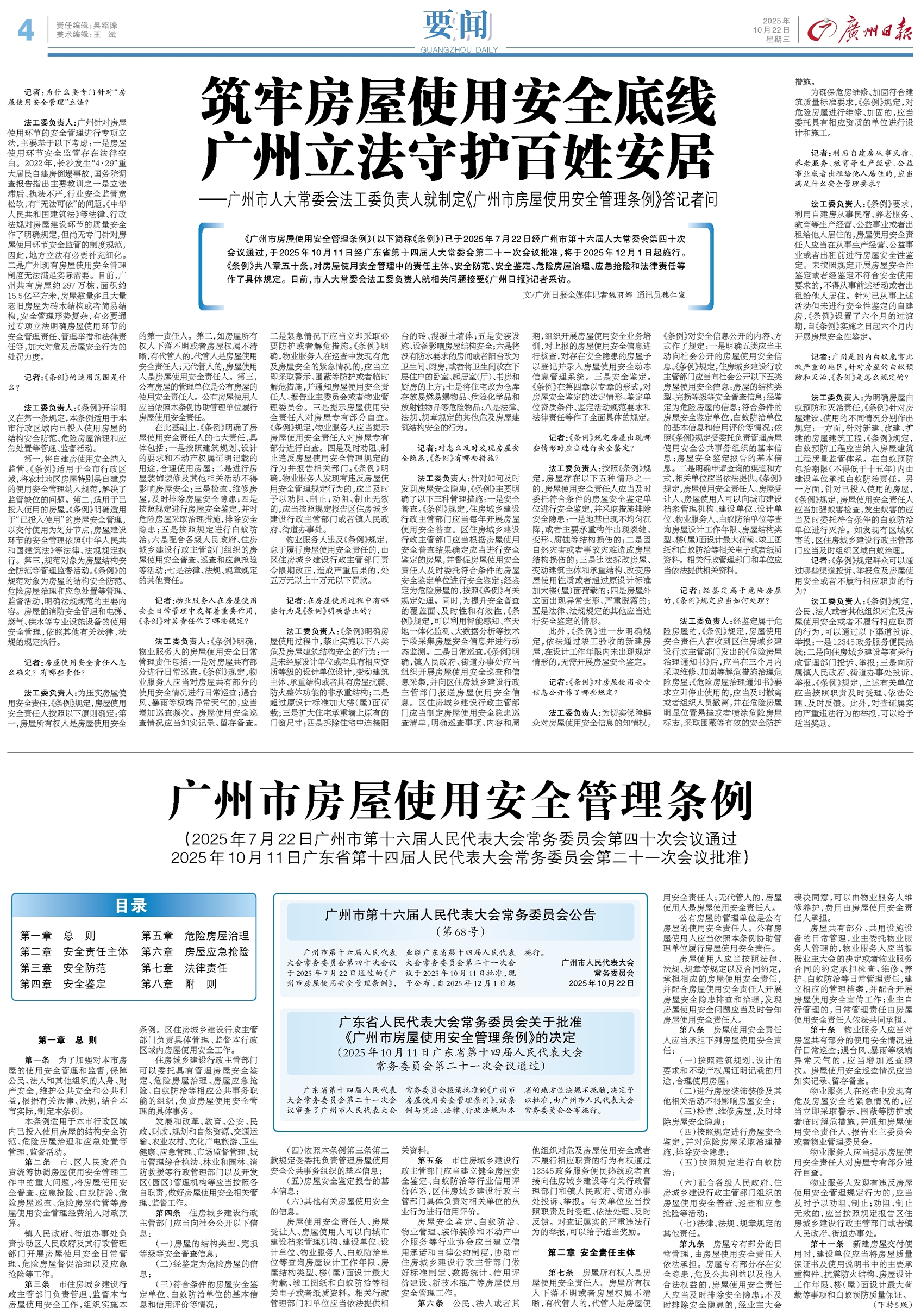 - 筑牢房屋使用安全底线 广州立法守护百姓安居 《广州市房屋使用安全管理条例》(以下简称《条例》)已于2025年7月22日经广州市第十六届人大常委会第四十次会议通过,于2025年10月11日经广东省第十四届人大常委会第二十一次会议批准,将于20