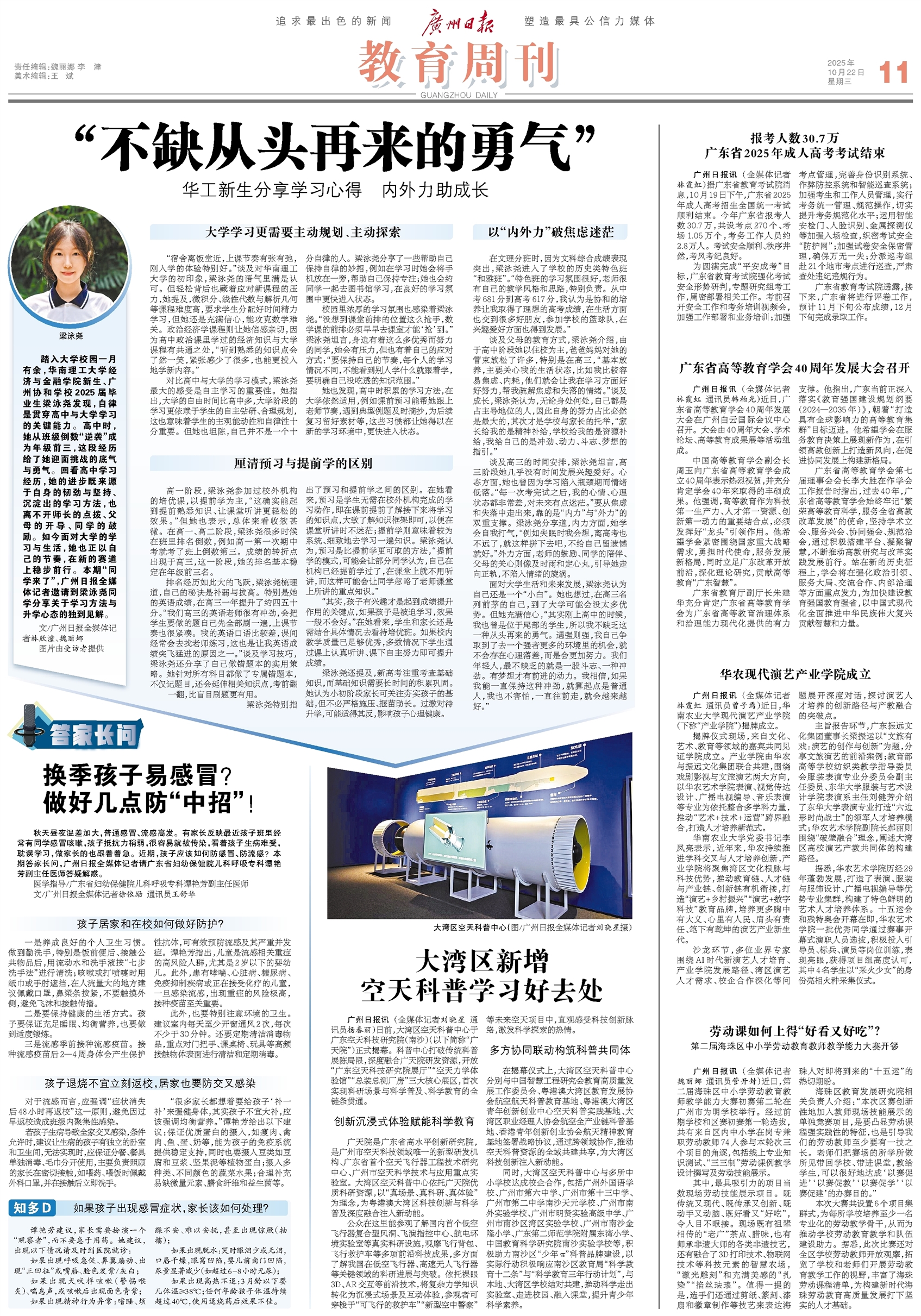 - “不缺从头再来的勇气” 踏入大学校园一月有余,华南理工大学经济与金融学院新生、广州协和学校2025届毕业生梁泳尧发现,自律是贯穿高中与大学学习的关键能力。高中时,她从班级倒数“逆袭”成为年级前三,这段经历给了她迎面挑战的