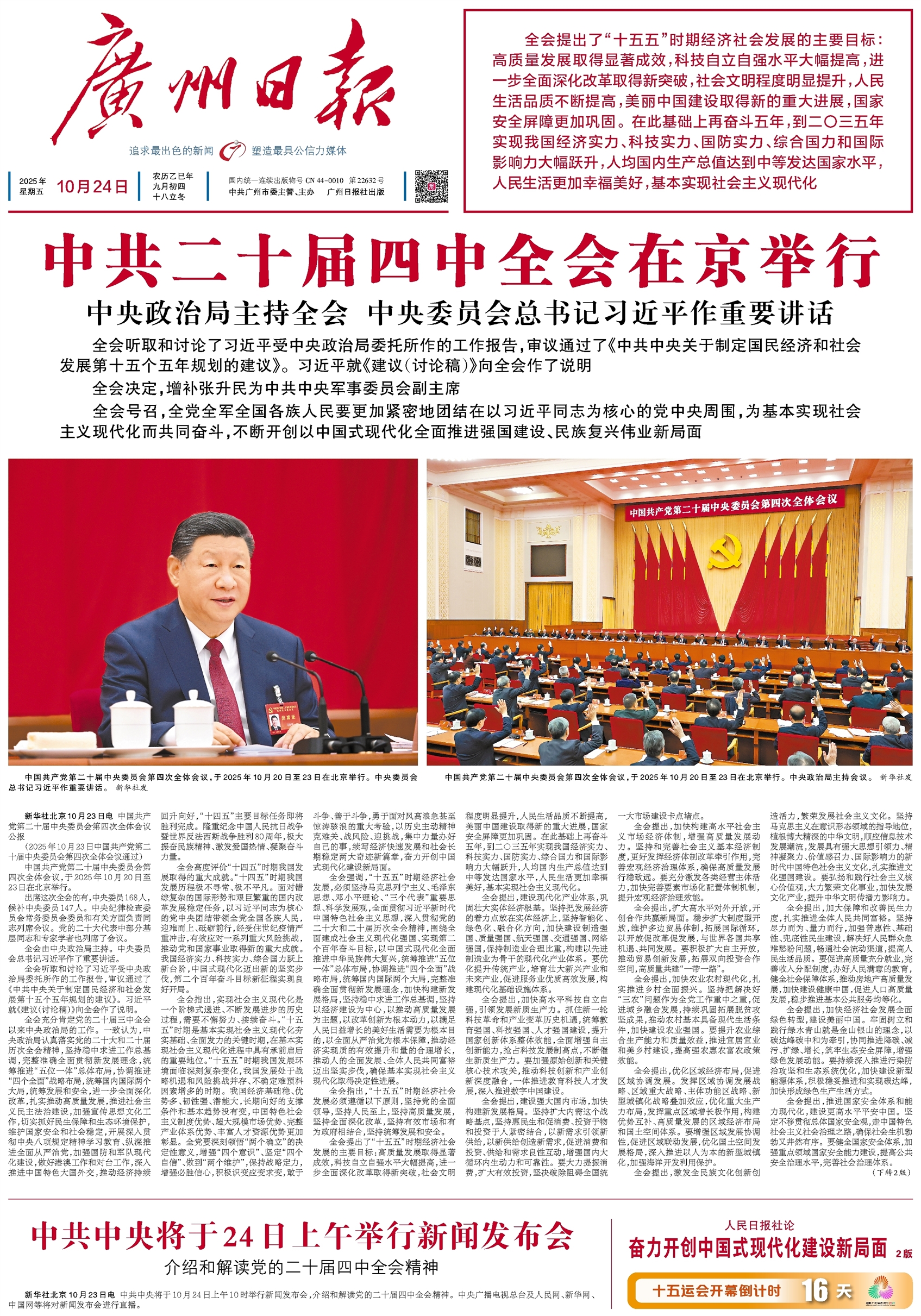 广州日报头版 A1中共二十届四中全会在京举行 2025-10-24 2 2025年10月24日 星期五