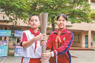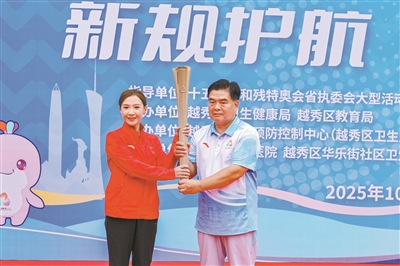 世界蹦床锦标赛冠军蔡琪子现场向全体师生宣读了《健康生活,你我同行倡议书》,呼吁大家共同践行健康生活方式迎接全运会。在迎全运“象征性火炬传递”活动上,蔡琪子从十五运会和残特奥会火炬传递工作指挥部专家组组长胡伟京手中接过全运火炬。在十五运会和残特奥会宣传推广曲《逐梦巅峰》歌声中,火炬在体育、卫健、疾控、学生、教师等各领域代表手中传递。伴随着“科学运动、健康体重、激情全运、活力湾区”的响亮口号,体育精神的种子已深深播撒在青少年心中。