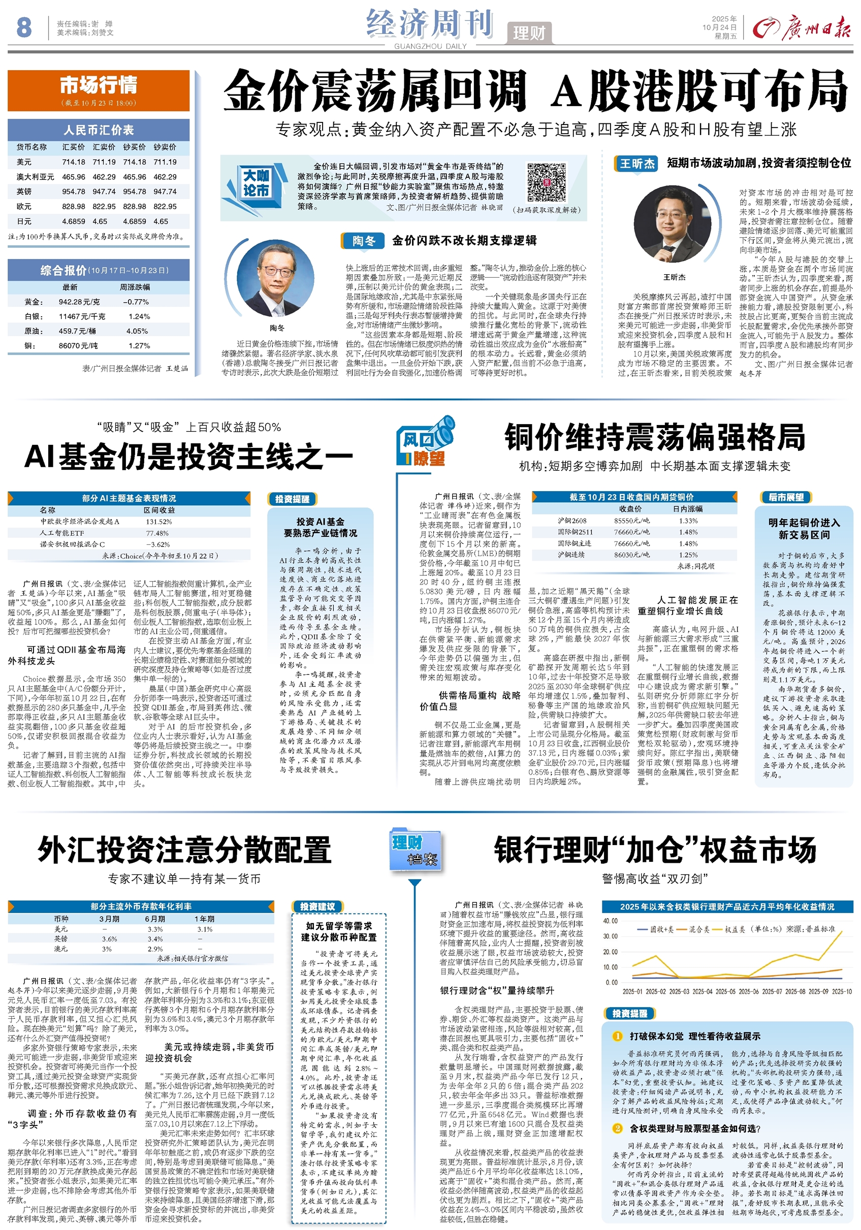 - 金价震荡属回调 A股港股可布局 大咖论市 金价连日大幅回调,引发市场对“黄金牛市是否终结”的激烈争论;与此同时,关税摩擦再度升温,四季度A股与港股将如何演绎?广州日报“钞能力实验室”聚焦市场热点,特邀资深经济学家与首席策