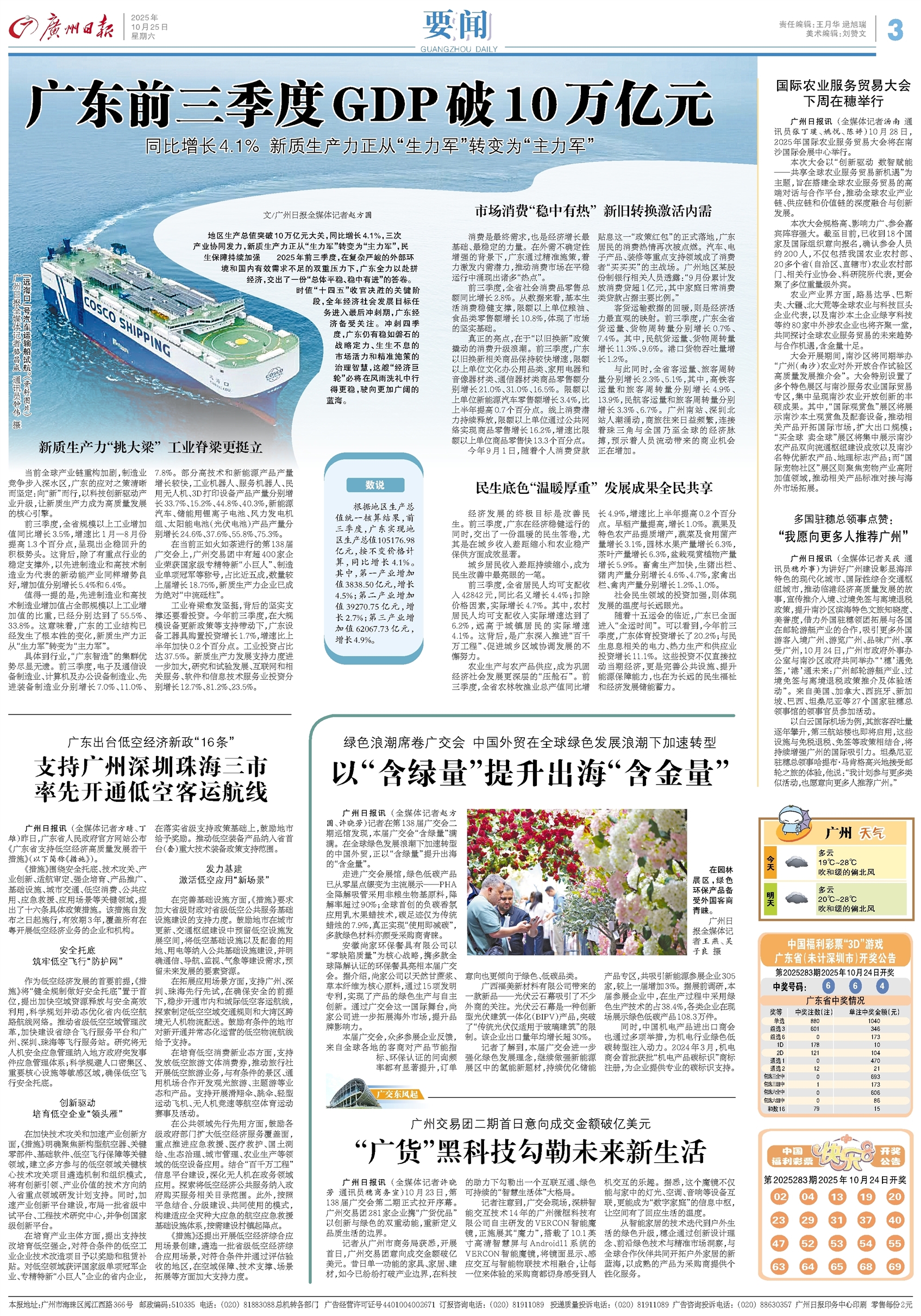 地区生产总值突破10万亿元大关,同比增长4.1%,三次产业协同发力,新质生产力正从“生力军”转变为“主力军”,民生保障持续加强……2025年前三季度,在复杂严峻的外部环境和国内有效需求不足的双重压力下,广东全力以赴拼经济,交出了一份“总体平稳、稳中有进”的答卷。