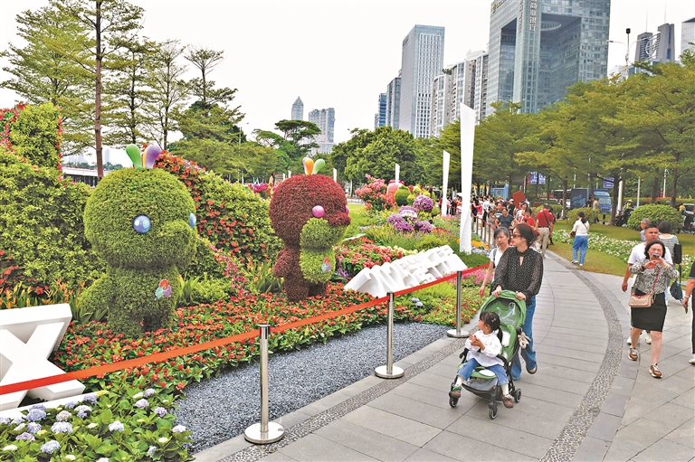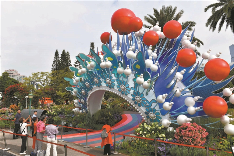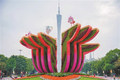 走进位于二沙岛的花城绿美园,广州各辖区打造的精品展园映入眼帘,展示出“花城”的文化多样性与开放包容,生动诠释“城园融合”的绿美生态理念。其中,荔湾园设计了超大凤冠艺术装置,将粤剧从舞台引入公共空间。天河园以广州塔为背景,融入全运会会徽“同心花绽”的设计细节,传递全运激情,共振湾区情谊。