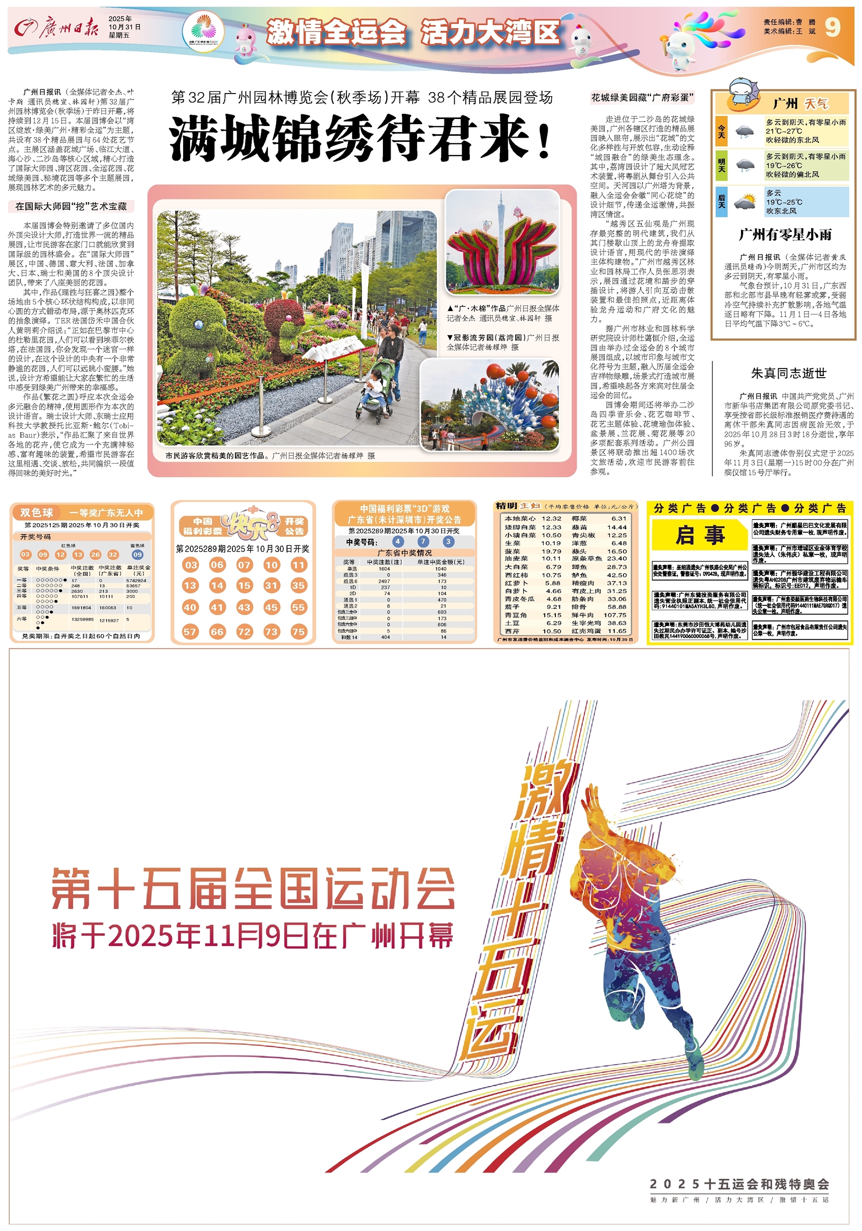 - 满城锦绣待君来! 广州日报讯 (全媒体记者全杰、叶卡斯 通讯员穗宣、林园轩)第32届广州园林博览会(秋季场)于昨日开幕,将持续到12月15日。本届园博会以“湾区绽放·绿美广州·精彩全运”为主题,共设有38个精品展园
