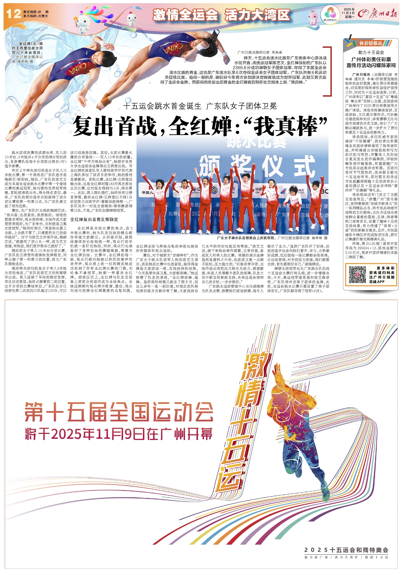 - 复出首战,全红婵:“我真棒” 广州日报全媒体记者 周婉琪 昨天,十五运会跳水比赛在广东奥体中心游泳跳水馆开赛,由奥运冠军陈艺文、全红婵领衔的广东队以2369.8分成功蝉联女子团体冠军,夺得了本届全运会跳水比赛的首金,这