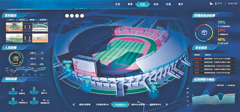 广州数字科技集团党委副书记、副董事长、总经理夏坚表示,公司对多个场馆实施智慧化改造,依托数据共享平台、GIS平台等广州智慧城市基础资源,采用“数字孪生+AIoT(人工智能物联网)”技术,搭建智慧运营管理云平台,可实时采集设备运行数据和优化人员调度,对赛事场馆进行统一管理,打造高效智能的“云端大脑”。