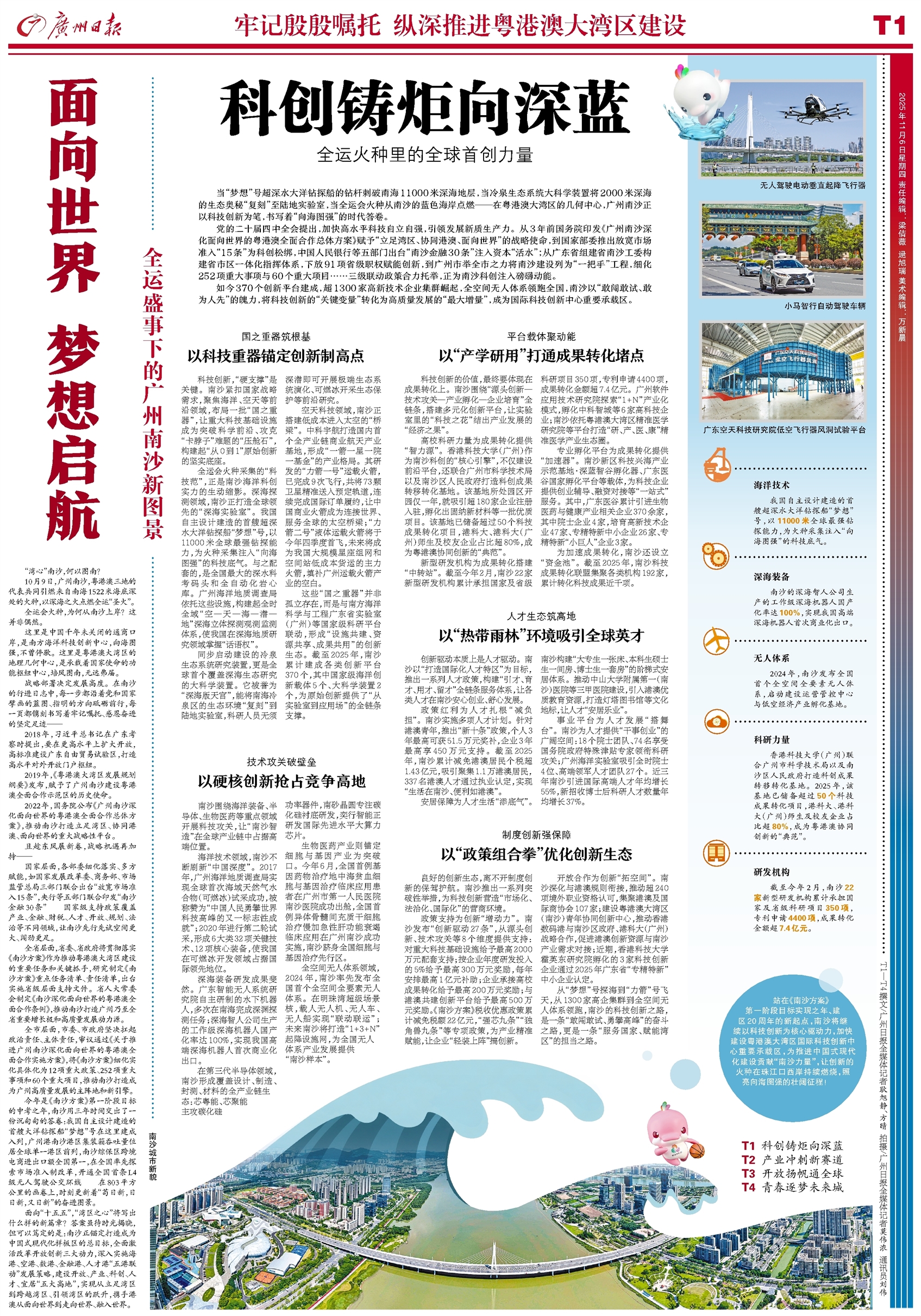 党的二十届四中全会提出,加快高水平科技自立自强,引领发展新质生产力。从3年前国务院印发《广州南沙深化面向世界的粤港澳全面合作总体方案》赋予“立足湾区、协同港澳、面向世界”的战略使命,到国家部委推出放宽市场准入“15条”为科创松绑,中国人民银行等五部门出台“南沙金融30条”注入资本“活水”;从广东省组建省南沙工委构建省市区一体化指挥体系,下放91项省级职权赋能创新,到广州市举全市之力将南沙建设列为“一把手”工程,细化252项重大事项与60个重大项目……三级联动政策合力托举,正为南沙科创注入磅礴动能。