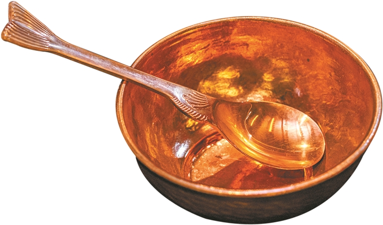 要传授西关打铜技艺,得先从它的魅力说起。苏师傅随手拿起一只金色大铜盘介绍,“铜盘蒸鸡是一道深受广州人喜爱的经典粤菜,铜传热快,能最大程度保留食材的原味和香气,蒸出来的鸡肉口感嫩滑。铜还能净化水质,用铜壶煮出来的茶水很甘甜。”听罢,小麦已迫不及待想打造一件既实用又耐用的铜器了。