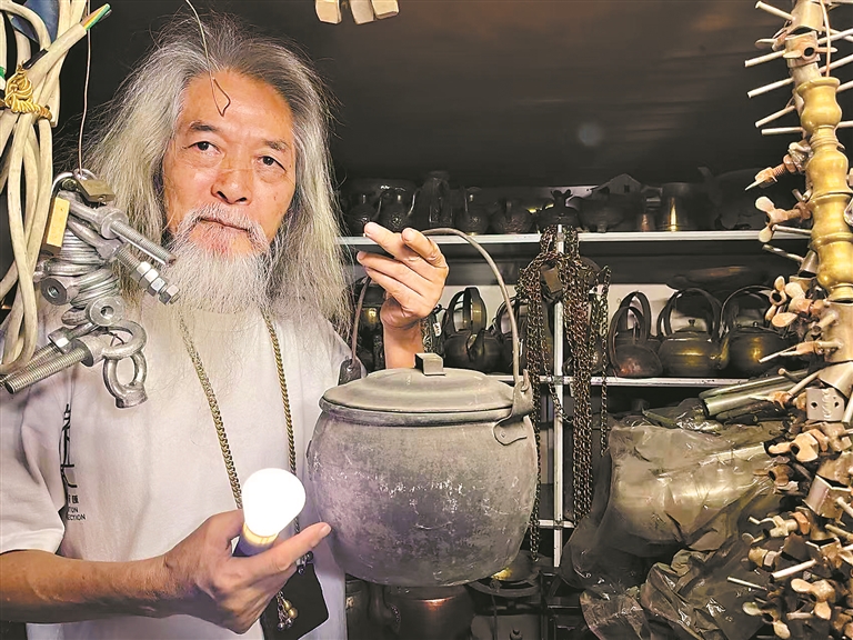这些年,痴迷打铜技艺的苏师傅走遍全国,寻来上千件“老古董”。走进位于三元里的冶金厂宿舍,小麦仿佛置身于“铜器博物馆”,昏黄灯光映衬着苏师傅收藏的云南奶茶壶、肇庆蒸糕盆、汕头茶壶等。师傅一手捧广州汤煲、一手提北方汤煲介绍,“北方的汤煲多是直身,而南方的多是马蹄形,又称‘马蹄煲’,虽然工艺复杂、制作工时长,但有利于积聚热量,煲汤特别香,在水上人家中很常见。”