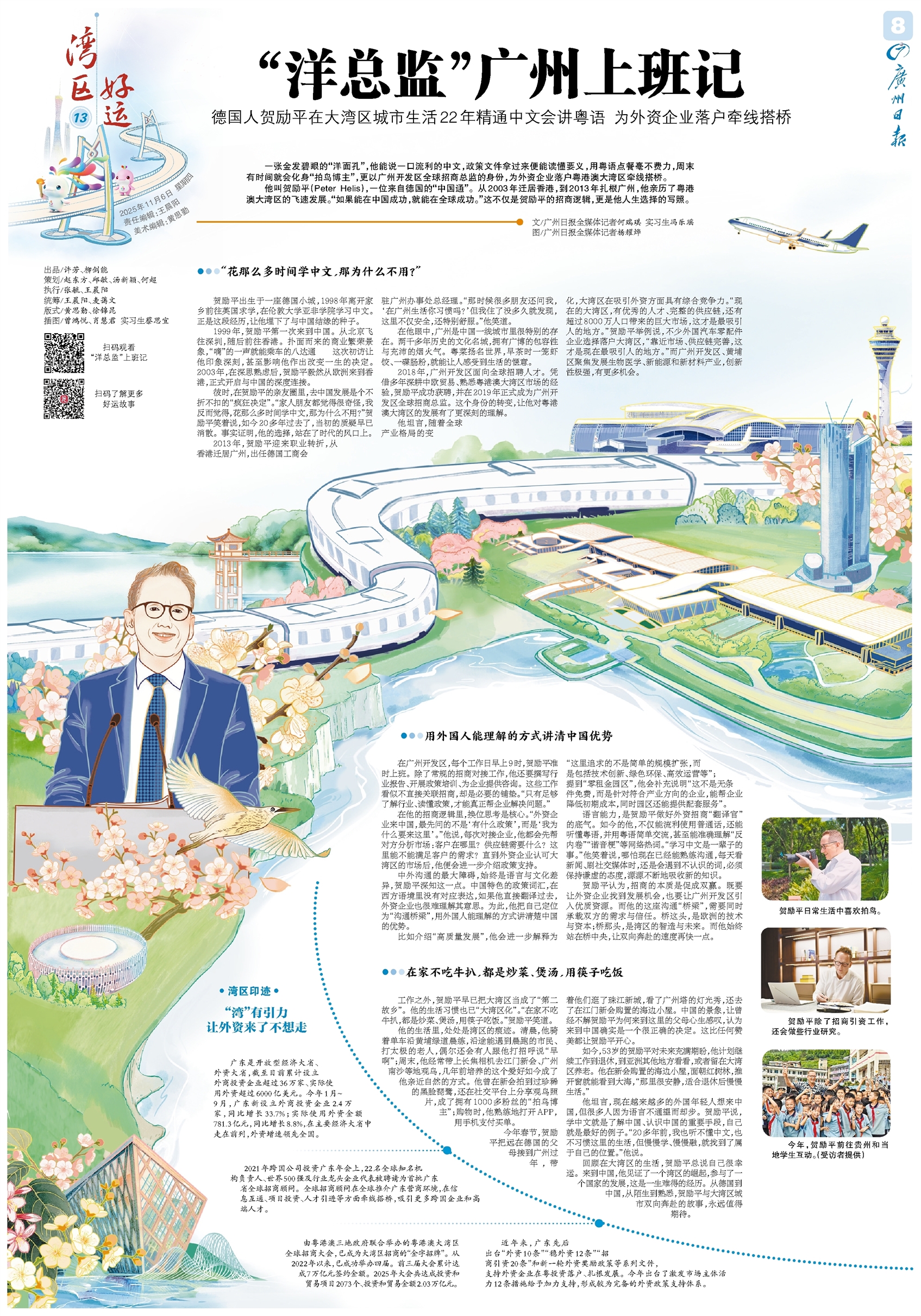 湾区好运13 一张金发碧眼的“洋面孔”,他能说一口流利的中文,政策文件拿过来便能读懂要义,用粤语点餐毫不费力,周末有时间就会化身“拍鸟博主”,更以广州开发区全球招商总监的身份,为外资企业落