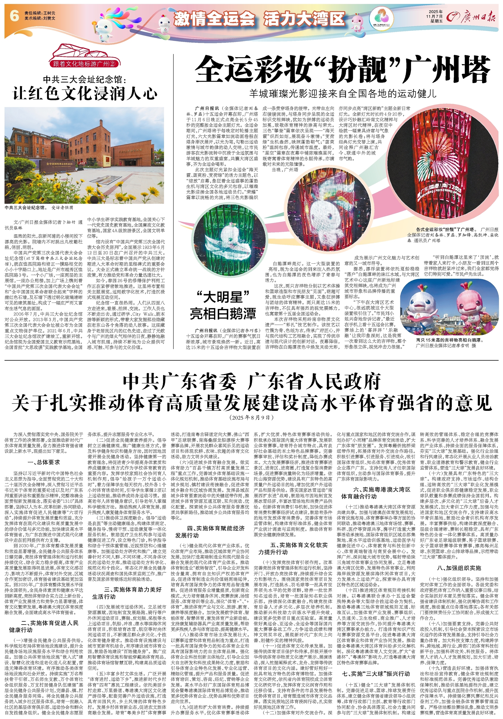 - 全运彩妆“扮靓”广州塔 广州日报讯 (全媒体记者刘春林、罗磊)十五运会开幕在即,广州塔于11月6日晚正式点亮全长5分45秒的完整版全运会主题灯光。全运会期间,广州塔将于每晚定时轮播主题灯光,六大光影篇章如流动画卷般在塔