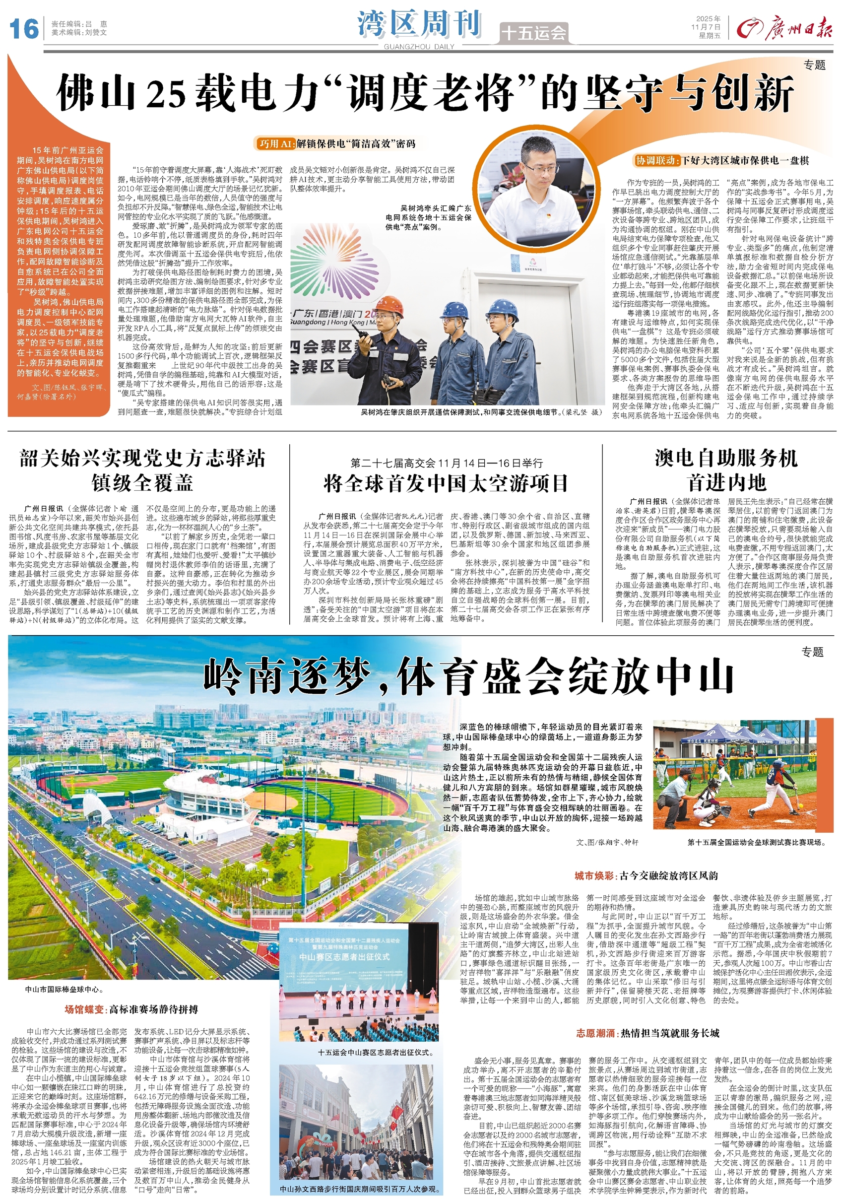 - 佛山25载电力“调度老将”的坚守与创新 15年前广州亚运会期间,吴树鸿在南方电网广东佛山供电局(以下简称佛山供电局)调度岗值守,手填调度报表、电话安排调度,响应速度属分钟级;15年后的十五运保供电期间,吴树鸿进入广东电网公司十五运会和残