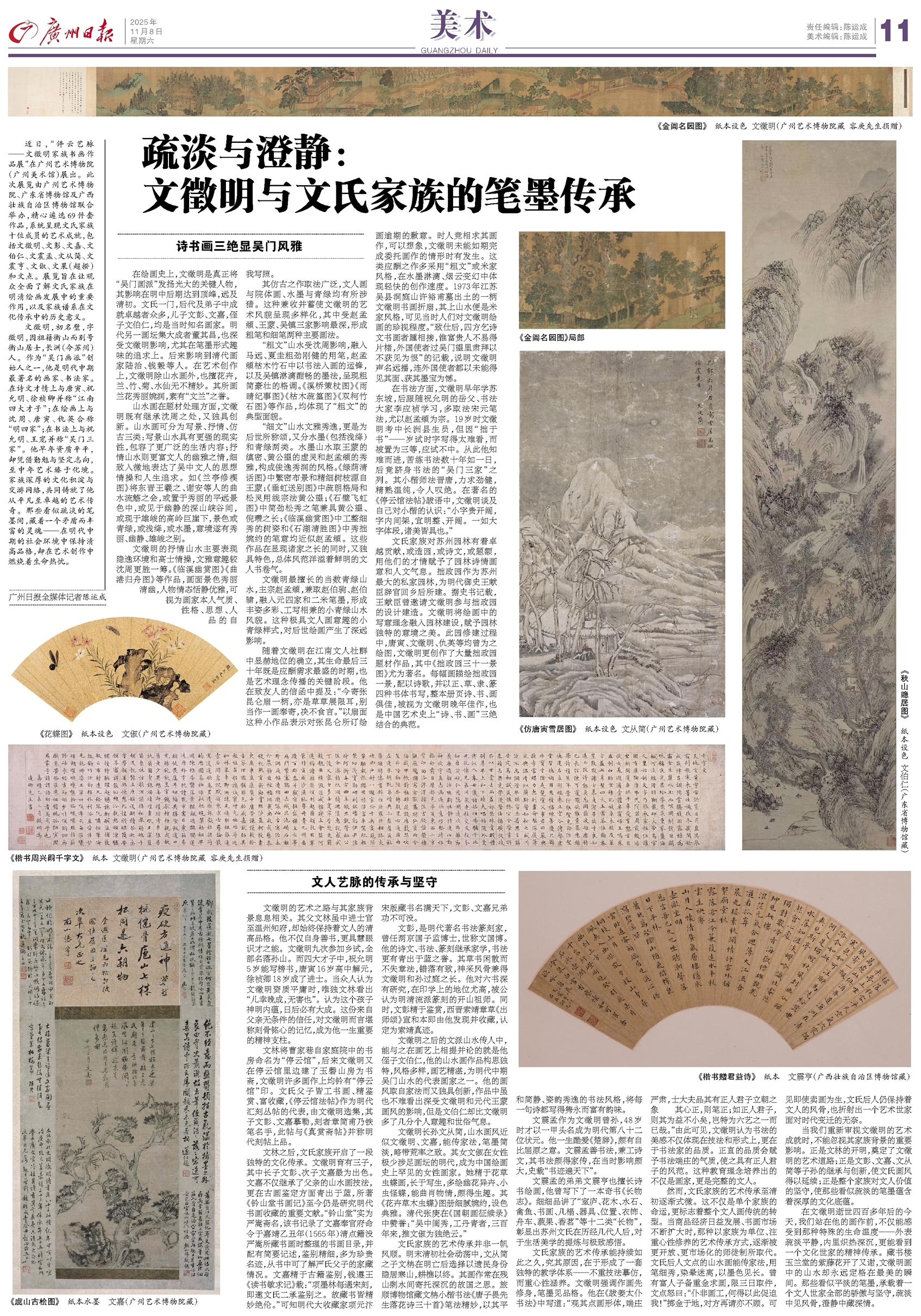 近日,“停云艺脉——文徵明家族书画作品展”在广州艺术博物院(广州美术馆)展出。此次展览由广州艺术博物院、广东省博物馆及广西壮族自治区博物馆联合举办,精心遴选69件套作品,系统呈现文氏家族十位成员的