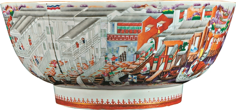 18世纪欧洲釉上彩工艺——画珐琅自海路传入广州后,为中国彩釉技术注入新的力量。尤其是风靡欧洲数百年的紫红、粉红,被大量运用于外销粉彩、广彩瓷之上。故宫博物院中收藏的清乾隆款画珐琅八棱开光山水花鸟图提梁壶、广东省博物馆收藏的清康熙款珐琅彩花碟纹碗,都是这种交流的结晶。