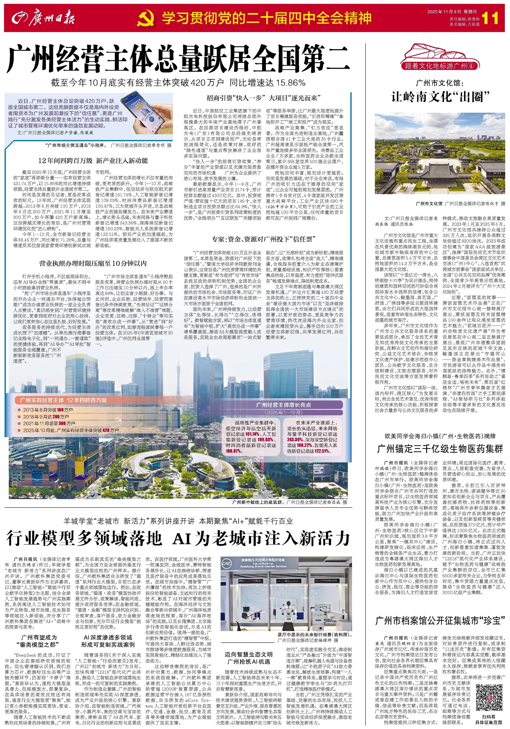 - 广州经营主体总量跃居全国第二 近日,广州经营主体总量突破420万户,跃居全国城市第二。这组亮眼数据不仅是海内外投资者用资本为广州发展前景投下的“信任票”,更是广州践行“充分激发各类经营主体活力”的生动实践,鲜活印证了城市营商