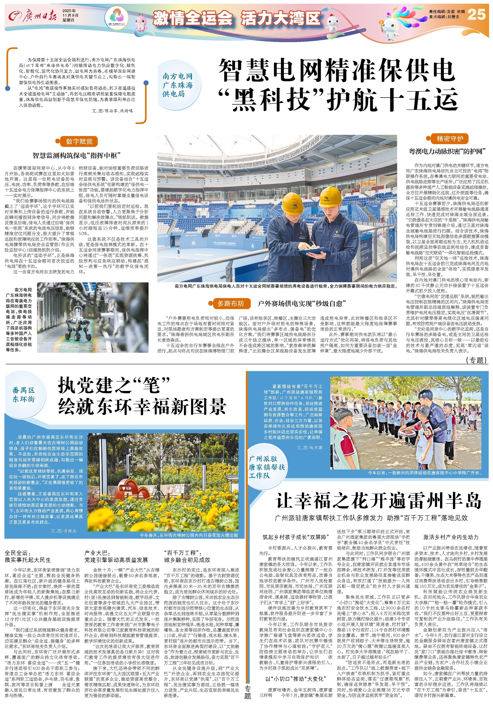 - 智慧电网精准保供电 “黑科技”护航十五运 为保障第十五届全运会顺利进行,南方电网广东珠海供电局(以下简称“珠海供电局”)持续推动电力供应数字化、绿色化、智能化、现代化协同发力,以电网为画卷,在横琴国际网球中心、户外自行车赛场及对澳供电关键