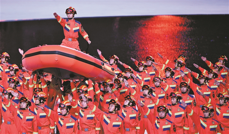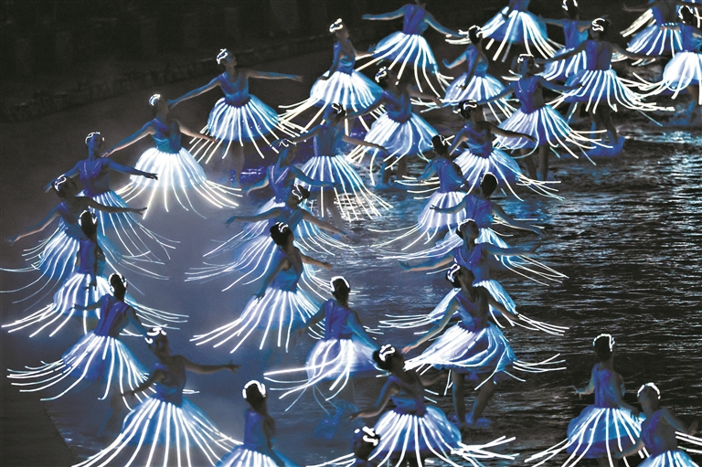 粤港澳大湾区的城市均临海靠水、因水而兴,有“水为财”的说法,开幕式表演以水作为核心表达,水的元素以不同形式呈现贯穿全场,水舞台更是应运而生,令人惊艳。在奥林匹克中心体育场,首次将同心圆与水面舞台结合,借助环形水幕舞台等前沿舞美技术,在体育场内“造出一片海”,“同心圆”意象与体现岭南特色与海洋文明的水舞台灵动特质相融,营造出极具美学特质和哲学意蕴的艺术空间。