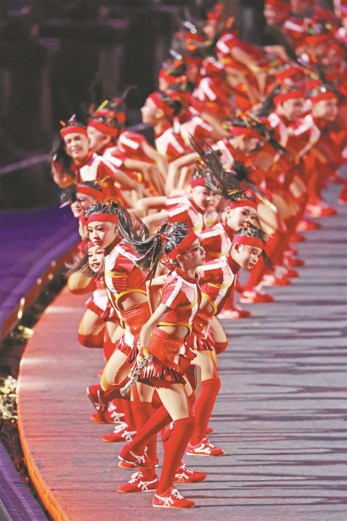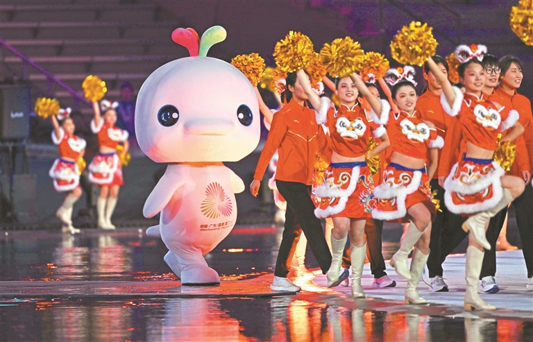 开幕式的大部分节目由粤港澳三地联合完成,将粤剧、咏春、麒麟等经典岭南文化元素与广绣、广珐琅、嵌瓷等非遗符号有机融合,现场还有独具岭南特色的花窗、芭蕉叶、灯笼等图案元素,诠释了“既岭南又动感”;更有机器人登场,带来“古今结合”的精彩节目,打造出一场视听交融的文化盛宴。