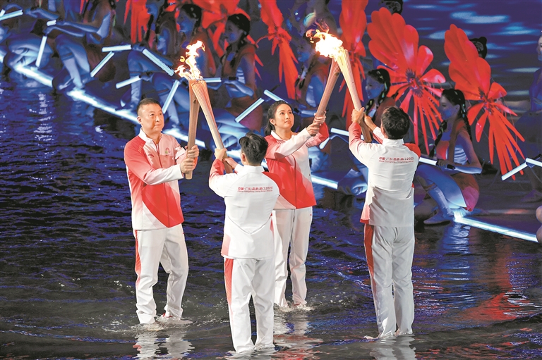 开幕式首次在大型活动中架构超级全彩色光谱灯具及百台超大功率激光矩阵,灯具均为广州本土制造。当第七棒的三名火炬手接到火炬时,台阶上倾泻而下“海水”,蓝色灯光铺上台阶上的“水”,并打亮穿透形成奔涌的浪花。三名火炬手踏浪而上,“海水”仿佛为他们开路,创意十足。整个开幕式的艺术效果在灯光的打造下完美呈现,彰显“中国创造”“广州智造”的强大实力和中国舞台科技装备的飞跃发展。