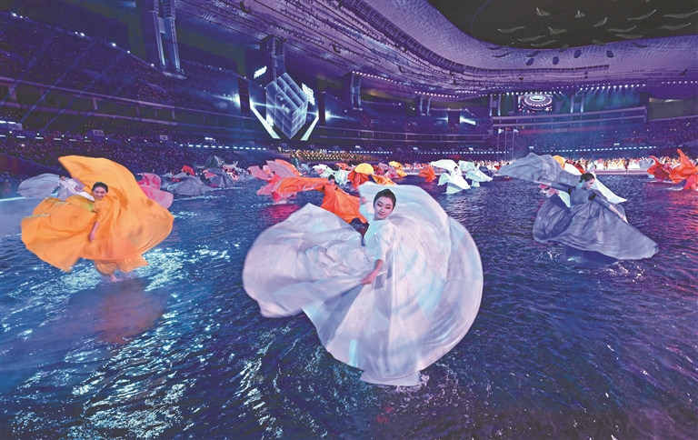 开幕式上,阳东霖将自己对岭南文化的了解,用另外一种区别于舞台艺术的形式,展现在偌大的体育场馆。对他来说,挑战最大的是“水舞台”,这是他第一次要设计上千套服装,完全要在水里表演。因为水对服装是很不友好的,湿了就会影响它的颜色和表现。为了能够将水的元素贯穿下来,数千套服装都要考虑涉水的功能性以及速干性,演员穿着的舒适感。
