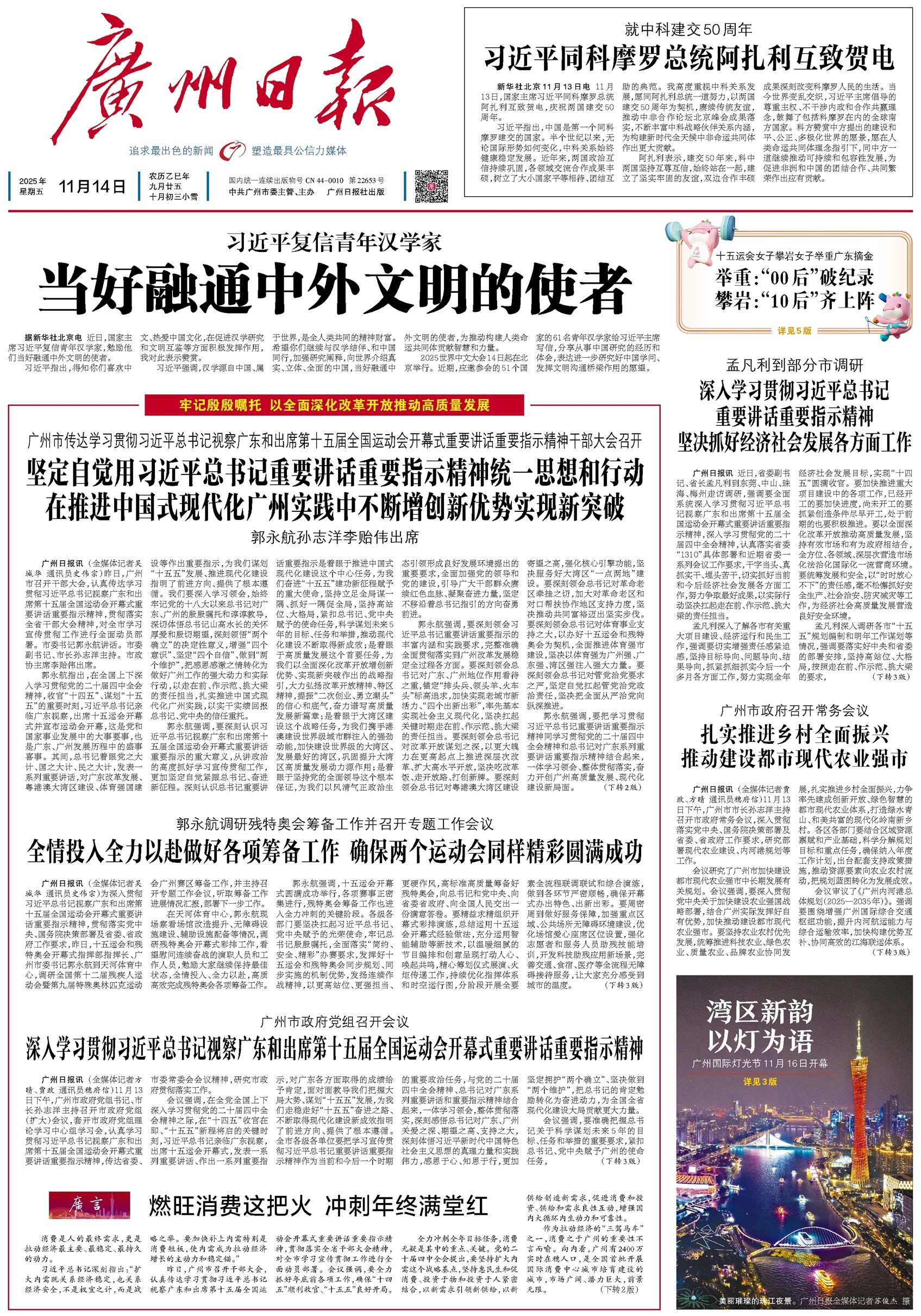 - 全情投入全力以赴做好各项筹备工作确保两个运动会同样精彩圆满成功 广州日报讯 (全媒体记者吴城华 通讯员史伟宗)为深入贯彻习近平总书记视察广东和出席第十五届全国运动会开幕式重要讲话重要指示精神,贯彻落实党中央、国务院决策部署及省委、省政府工作要求,昨日,十五运