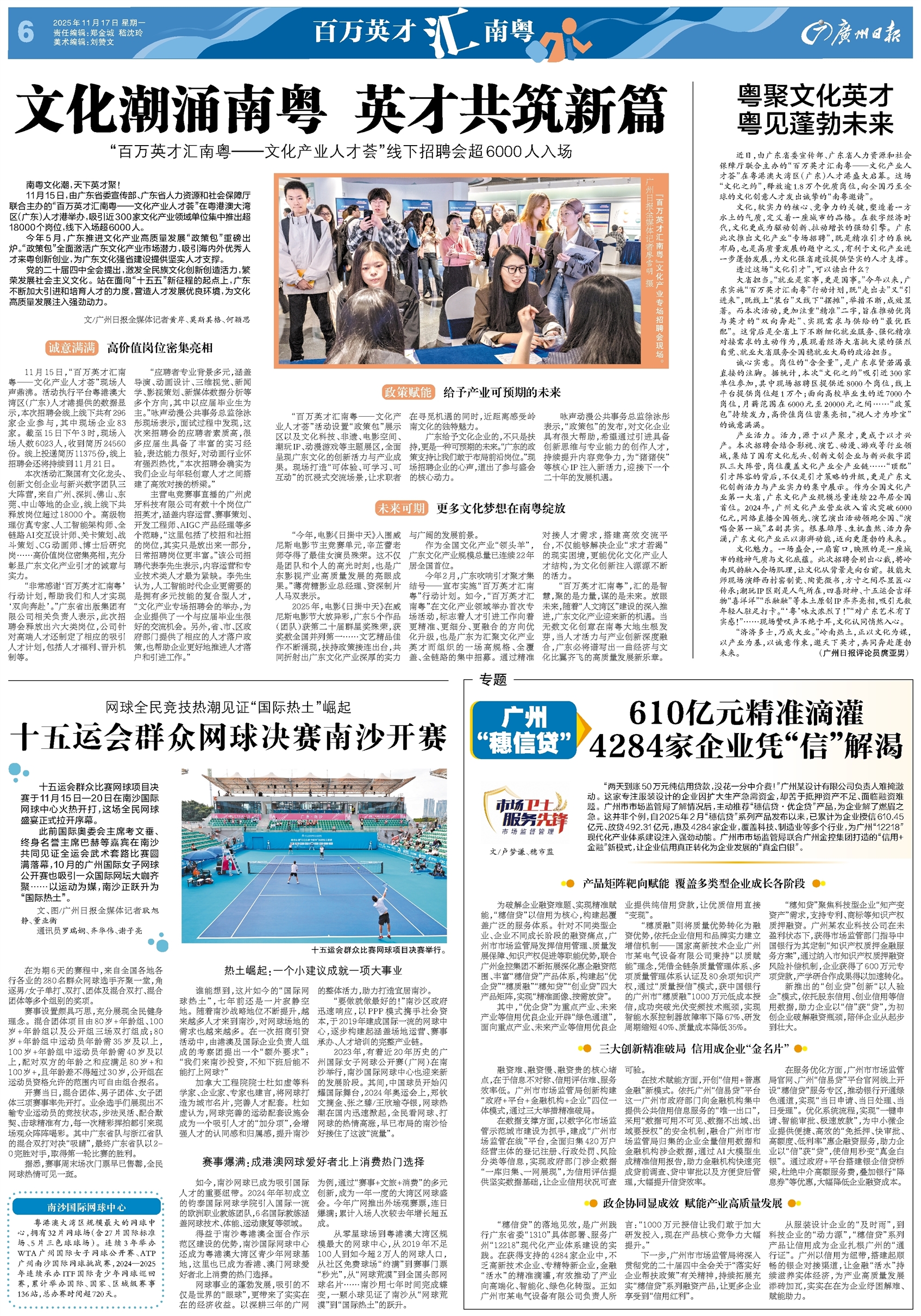 - 文化潮涌南粤 英才共筑新篇 南粤文化潮,天下英才聚! 11月15日,由广东省委宣传部、广东省人力资源和社会保障厅联合主办的“百万英才汇南粤——文化产业人才荟”在粤港澳大湾区(广东)人才港举办,吸引近300家文化产业领域单