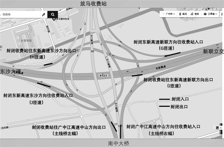 放马收费站出入口匝道实施全封闭施工,广中江高速主线往放马收费站方向匝道出入口、东新高速东沙方向和新联方向往放马收费站匝道出入口实施全封闭施工作业,禁止所有车辆通行(辖区高速公路管理、施工车辆除外)。